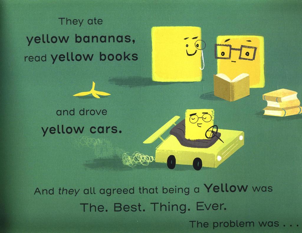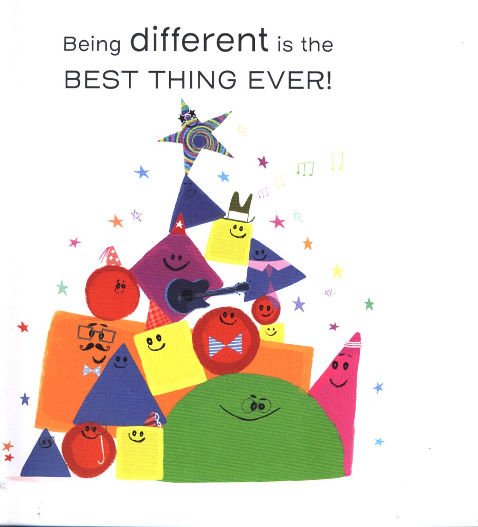 In this story, the author makes it clear that even if someone is different to you, the two of you can still be friends. There are shapes and colors.